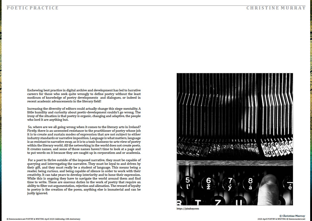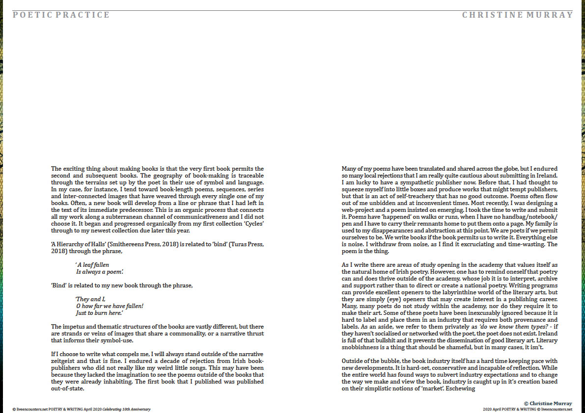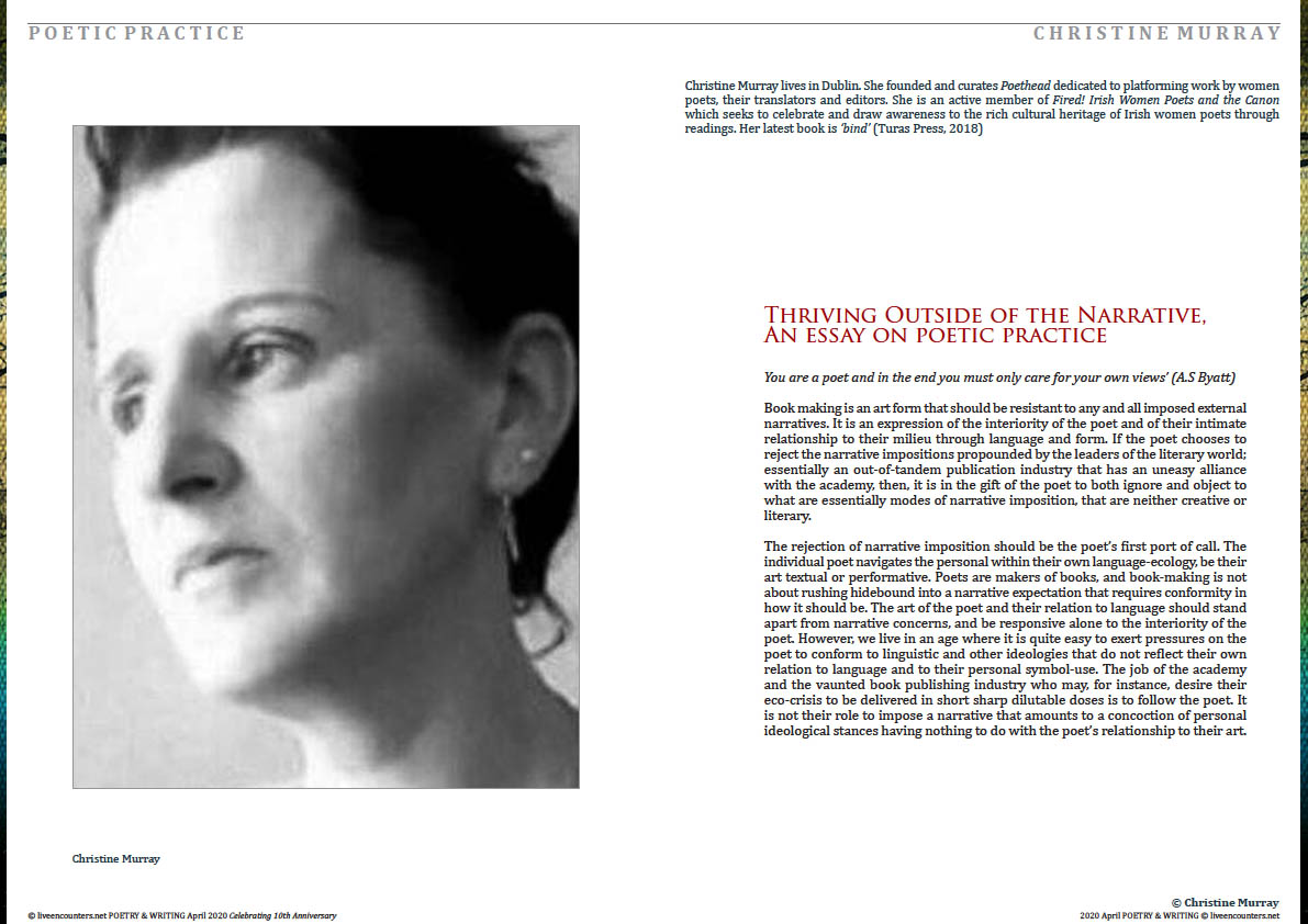 Chris Murray lives in Dublin. She founded and curates Poethead dedicated to platforming work by women poets, their translators and editors. She is an active member of Fired! Irish Women Poets and the Canon which seeks to celebrate and draw awareness to the rich cultural heritage of Irish women poets through readings. Her latest book is ‘bind’ (Turas Press, 2018).