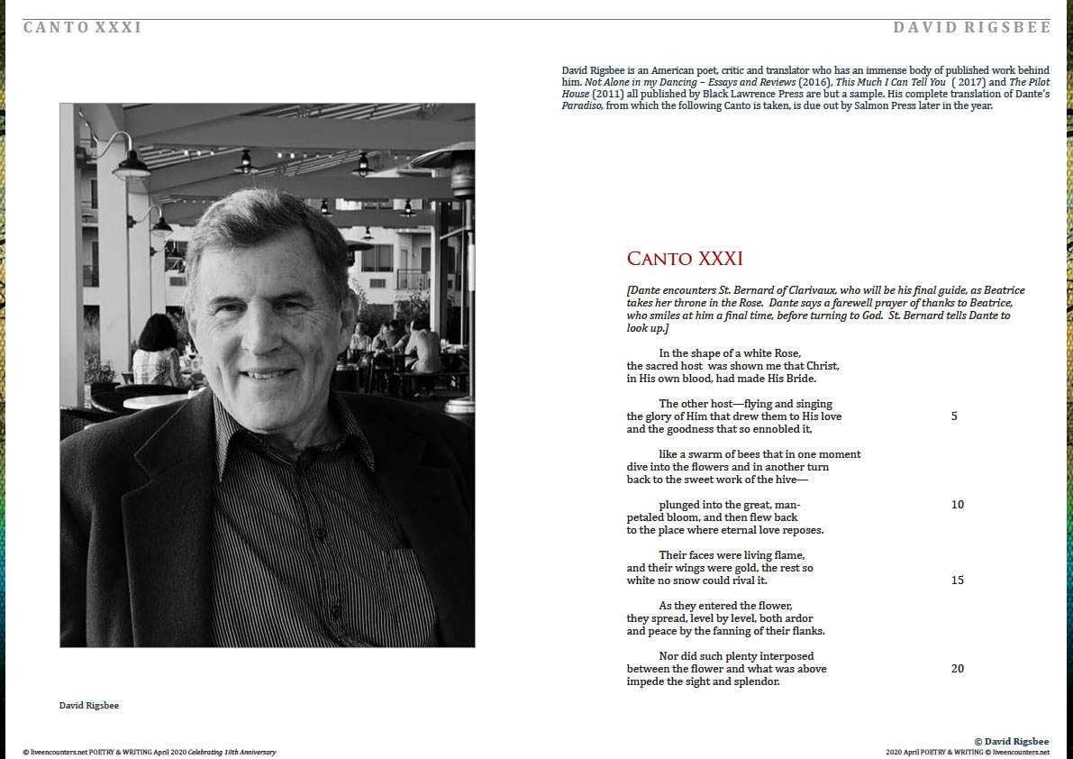 David Rigsbee is an American poet, critic and translator who has an immense body of published work behind him. Not Alone in my Dancing – Essays and Reviews (2016) , This Much I Can Tell You  ( 2017) and The Pilot House (2011) all published by Black Lawrence Press are but a sample. His complete translation of Dante’s Paradiso, from which the following Canto is taken, is due out by Salmon Press later in the year.