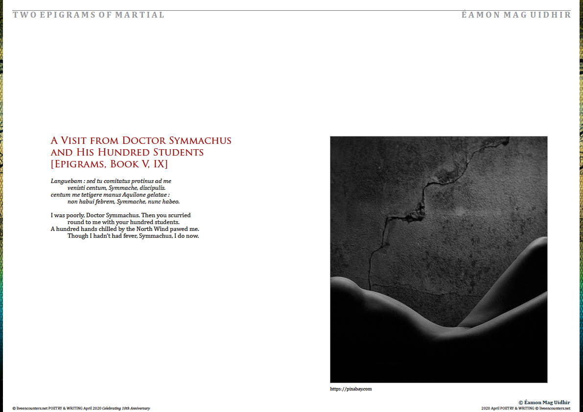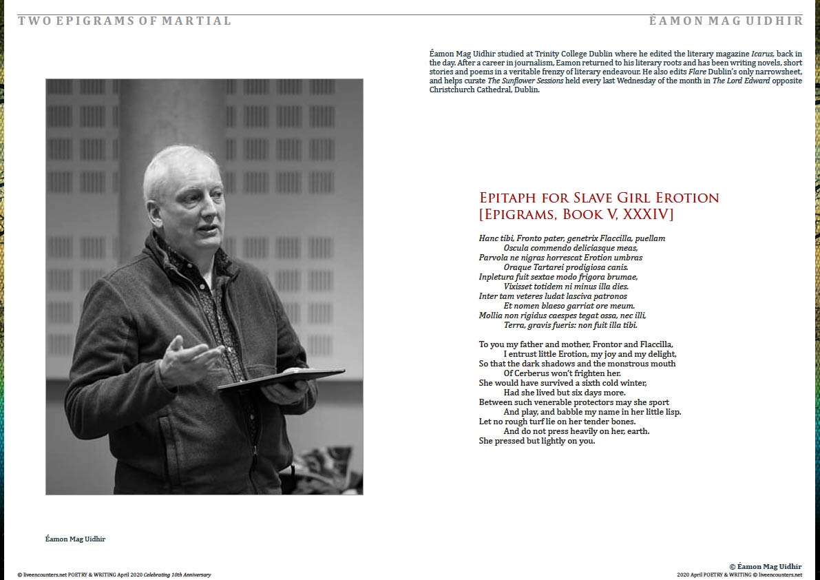 Éamon Mag Uidhir first appeared in print as a poet in 1969. While at Trinity College during the 1970s he edited Icarus and TCD Miscellany. He spent twenty years as a newspaper journalist and a further twenty as an editor, before returning to writing. Since then he has published poems in many magazines and read in venues around Ireland, and also in Paris and Barcelona. He is currently editor of the quarterly poetry narrowsheet FLARE www.flare.ie and has edited a number of poetry collections.