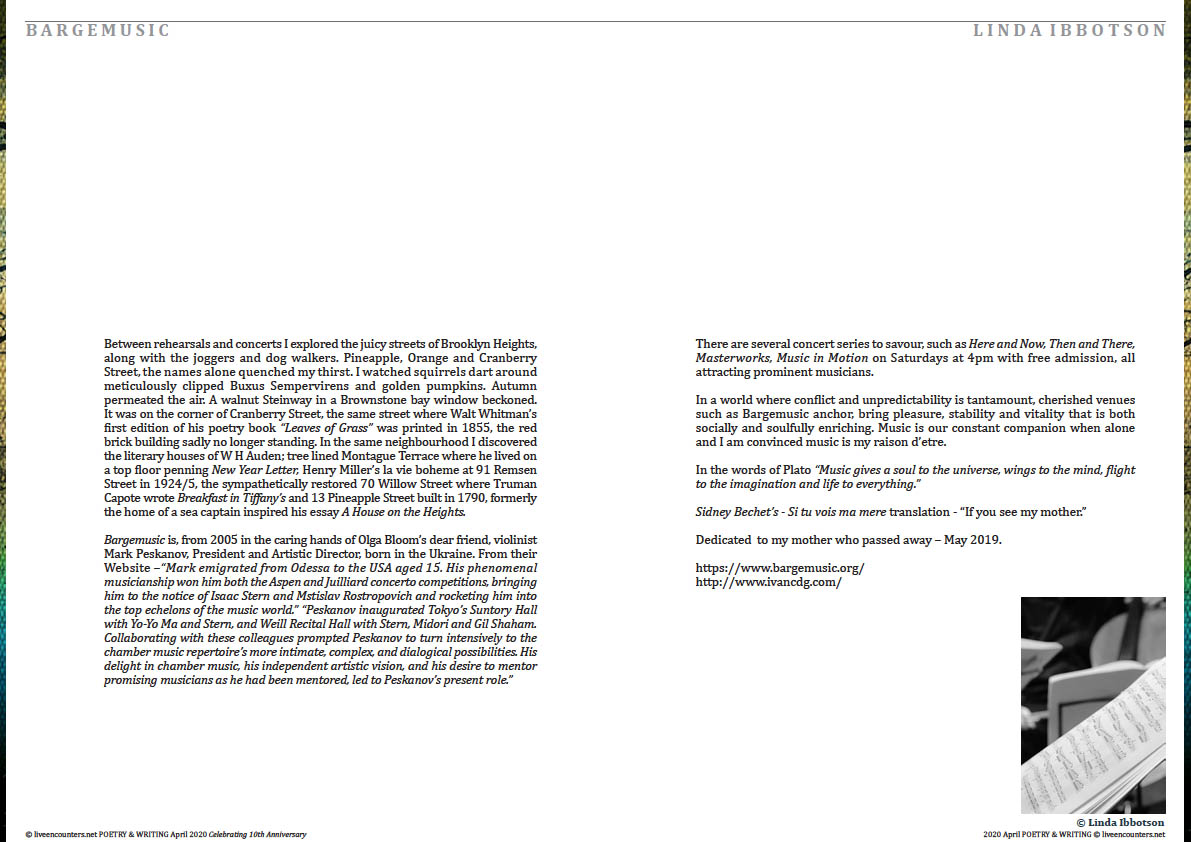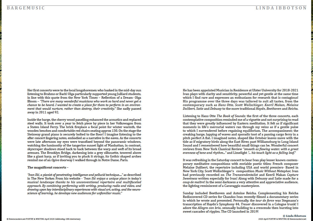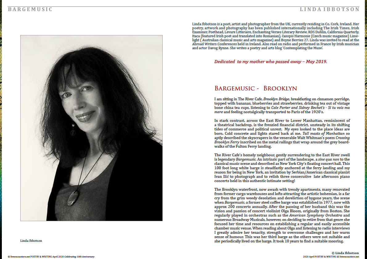 Linda Ibbotson is a poet, artist and photographer from the UK, currently residing in Co. Cork, Ireland. Her poetry, artwork and photography has been published internationally including The Irish Times, Irish Examiner, Poethead, Levure Litteraire, Enchanting Verses Literary Review, RDS Dublin, California Quarterly, Itaca (featured Irish poet and translated into Romanian), časopis Harmonie (Czech music magazine) Limelight (Australian classical music and arts magazine) and Boyne Berries 27. Linda was invited to read at the Abroad Writers Conferences held in Ireland. Also read on radio and performed in France by Irish musician and actor Davog Rynne. She writes a poetry and arts blog ‘Contemplating the Muse.’