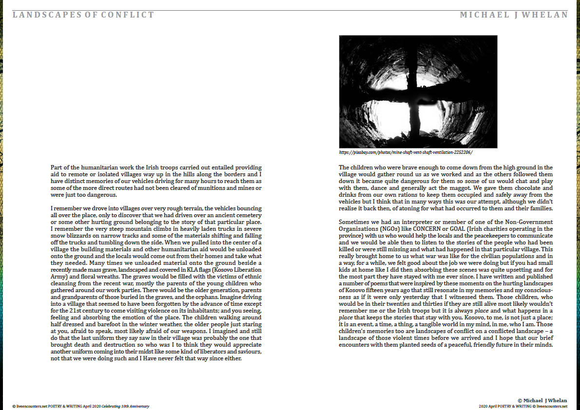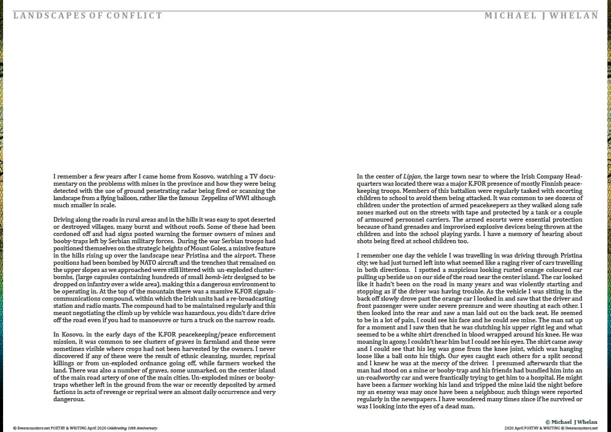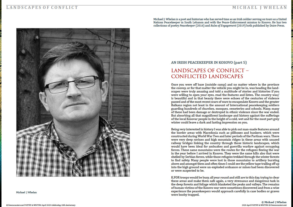 Michael J. Whelan is a poet and historian who has served time as an Irish soldier serving on tours as a United Nations Peacekeeper in South Lebanon and with the Peace-Enforcement mission to Kosovo. He has two collections of poetry Peacekeeper (2016) and Rules of Engagement (2019) both published by Doire Press.