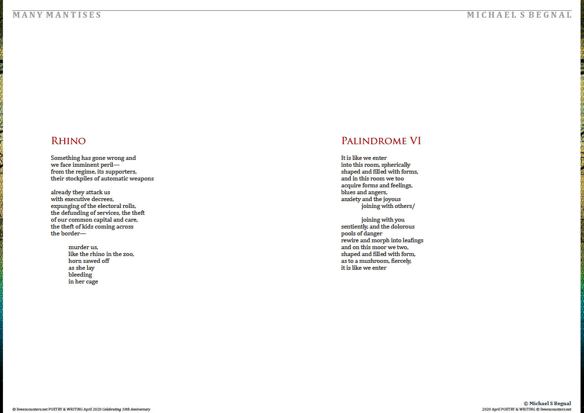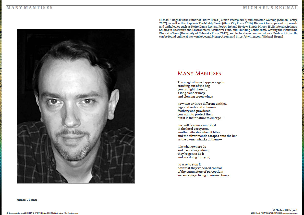 Michael Begnal is the author of Future Blues (Salmon Poetry, 2012) and Ancestor Worship (Salmon Poetry, 2007), as well as the chapbook The Muddy Banks (Ghost City Press, 2016). His work has appeared in journals and anthologies such as Notre Dame Review, Poetry Ireland Review, Empty Mirror, ISLE: Interdisciplinary Studies in Literature and Environment, Scoundrel Time, and Thinking Continental: Writing the Planet One Place at a Time (University of Nebraska Press, 2017), and he has been nominated for a Pushcart Prize. He can be found online at www.mikebegnal.blogspot.com and https://twitter.com/Michael_Begnal.
