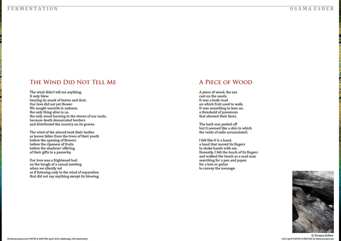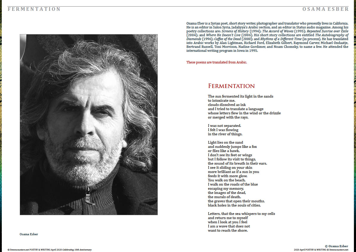 Osama Esber is a Syrian poet, short story writer, photographer and translator who presently lives in California. He is an editor in Salon Syria, Jadaliyya’s Arabic section, and an editor in Status audio magazine. Among his poetry collections are: Screens of History (1994); The Accord of Waves (1995); Repeated Sunrise over Exile (2004); and Where He Doesn’t Live (2006). His short story collections are entitled The Autobiography of Diamonds (1996); Coffee of the Dead (2000); and Rhythms of a Different Time (in process). He has translated into Arabic works by Alan Lightman, Richard Ford, Elizabeth Gilbert, Raymond Carver, Michael Ondaatje, Bertrand Russell, Toni Morrison, Nadine Gordimer, and Noam Chomsky, to name a few. He attended the international writing program in Iowa in 1995.