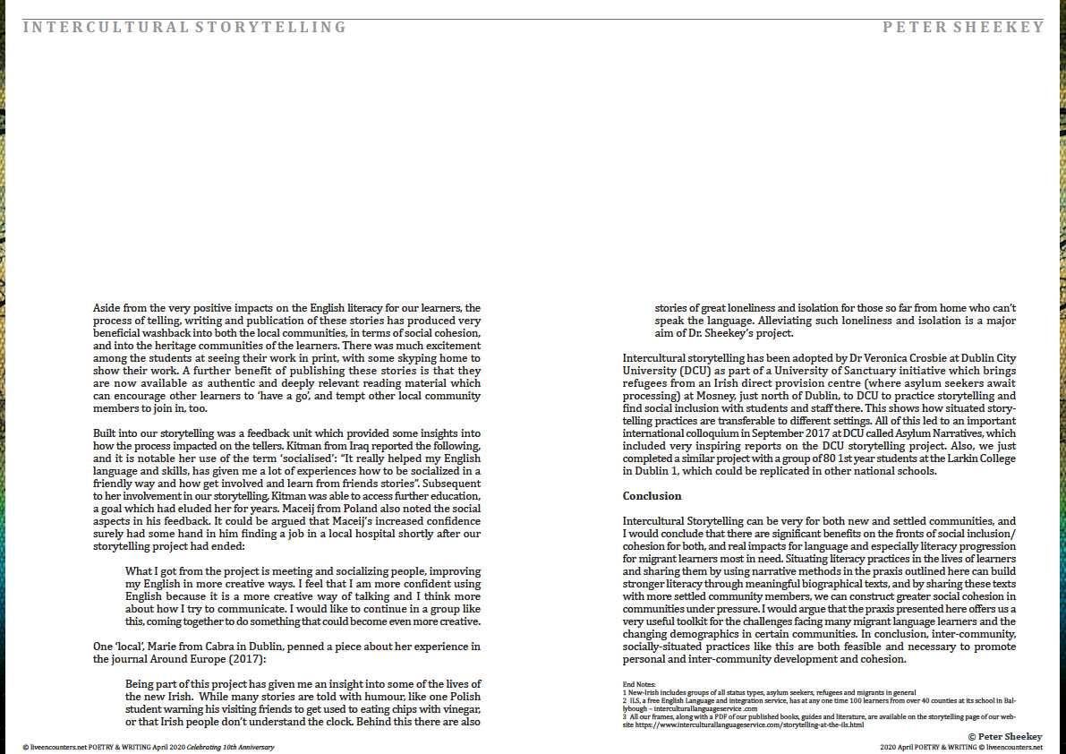 Dr Peter Sheekey is originally from Cabra, Dublin but spent 15 years working as a teacher in Switzerland and Italy. For the past two decades, Peter has been a researcher and practitioner in the field of second language learning and social orientation for refugees and migrants in Dublin. His doctoral research focussed on the lived experiences and social barriers facing border-crossing adult migrant English language learners in Ireland. On foot of these studies, he set up the Intercultural Language Service in Ballybough, Dublin to meet these challenges. Also, he has created the Intercultural Storytelling Project, where members of local and new communities share their stories to promote greater intercommunity understanding and social cohesion.
