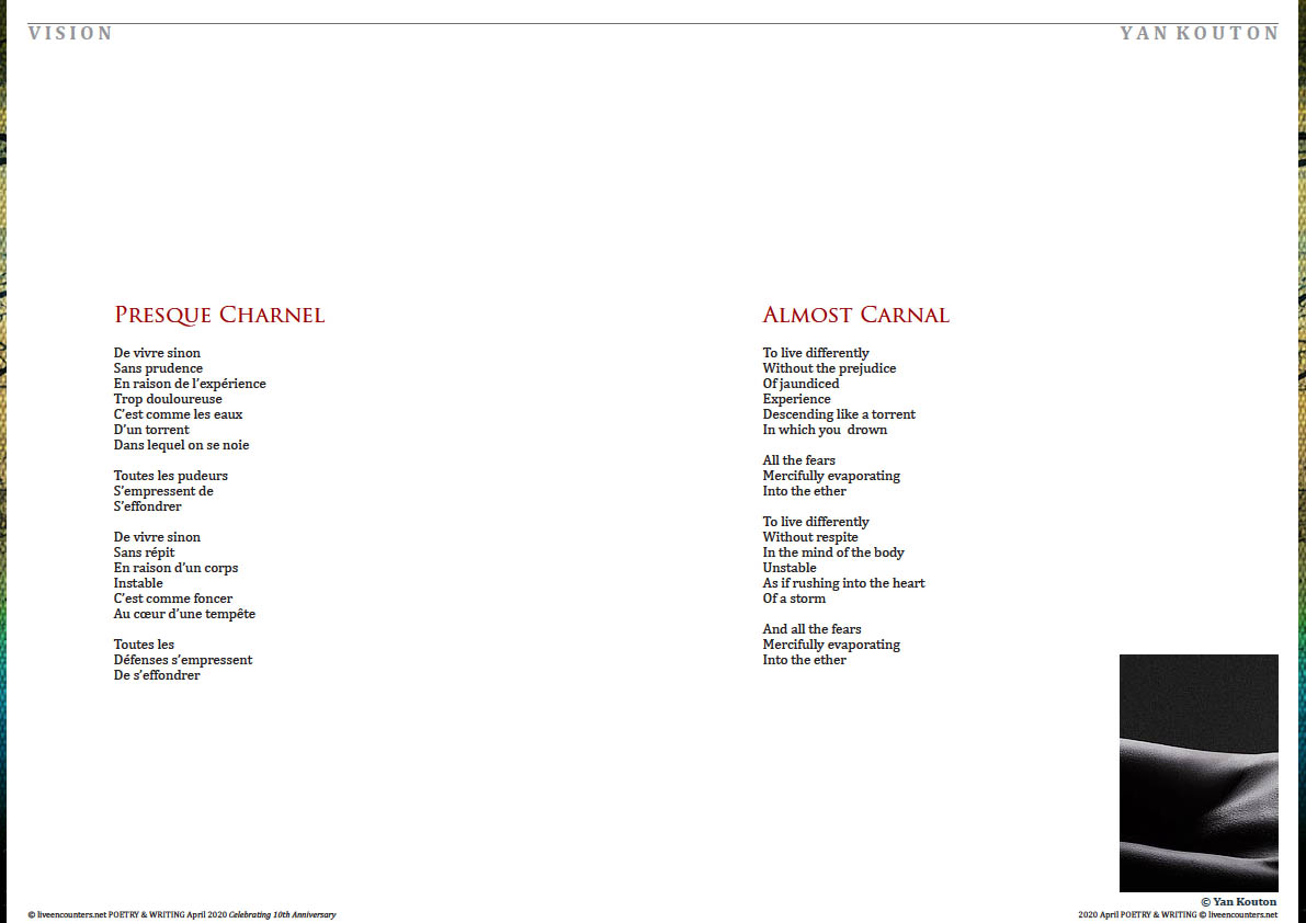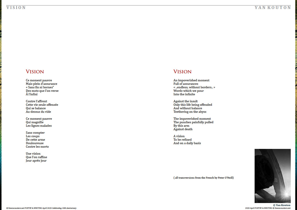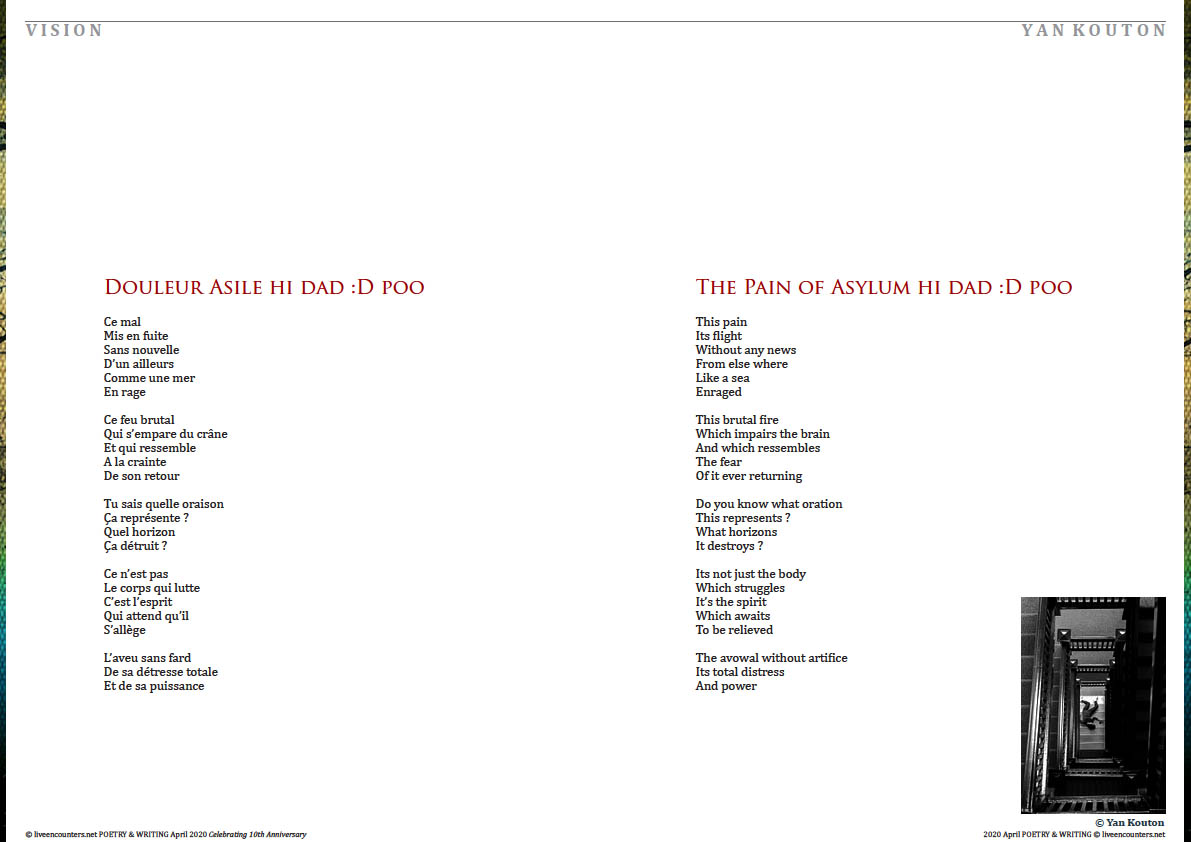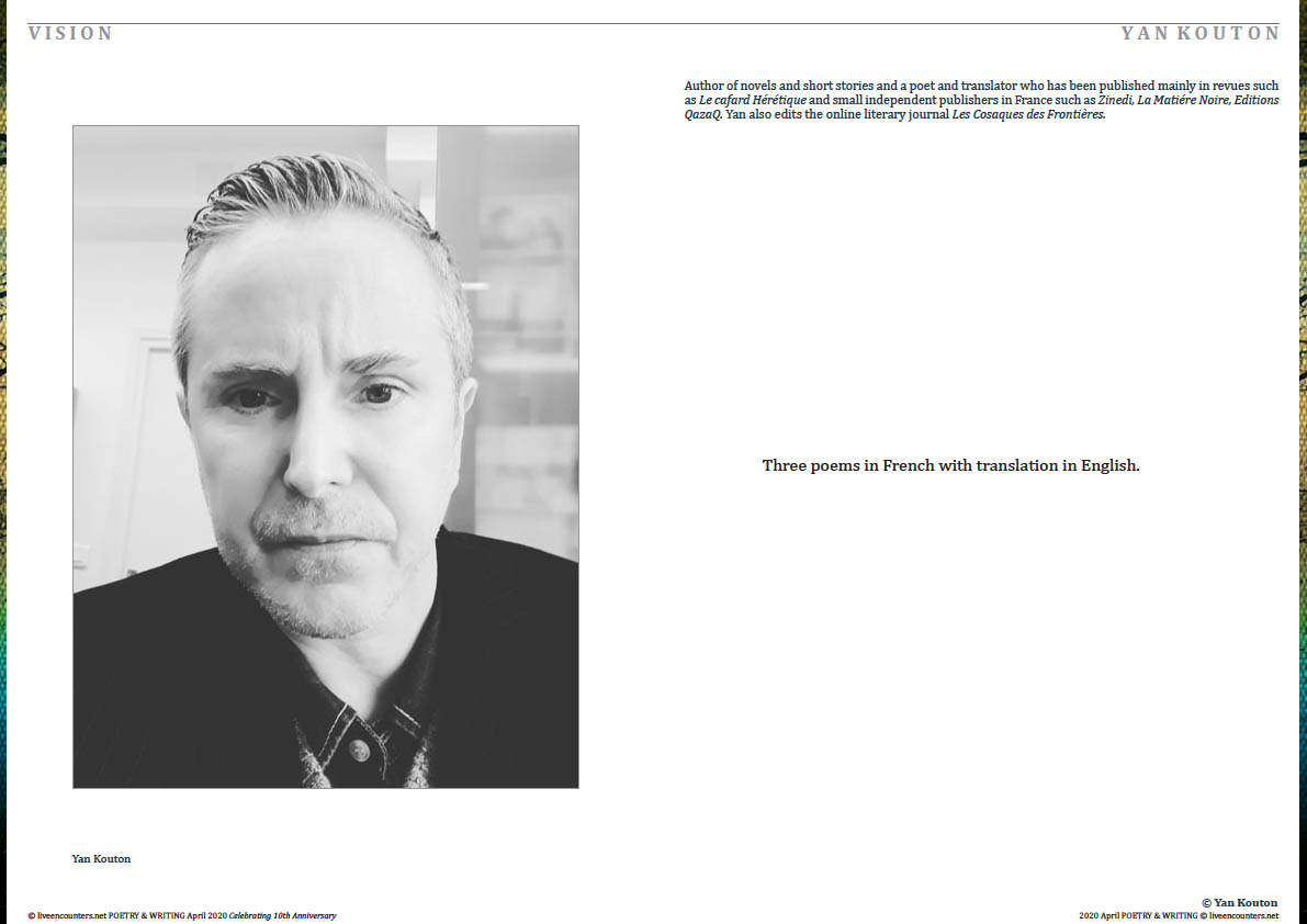 Author of novels and short stories and a poet and translator who has been published mainly in revues such as Le cafard Hérétique and small independent publishers in France such as Zinedi, La Matiére Noire, Editions QazaQ. Yan also edits the online literary journal Les Cosaques des Frontières.