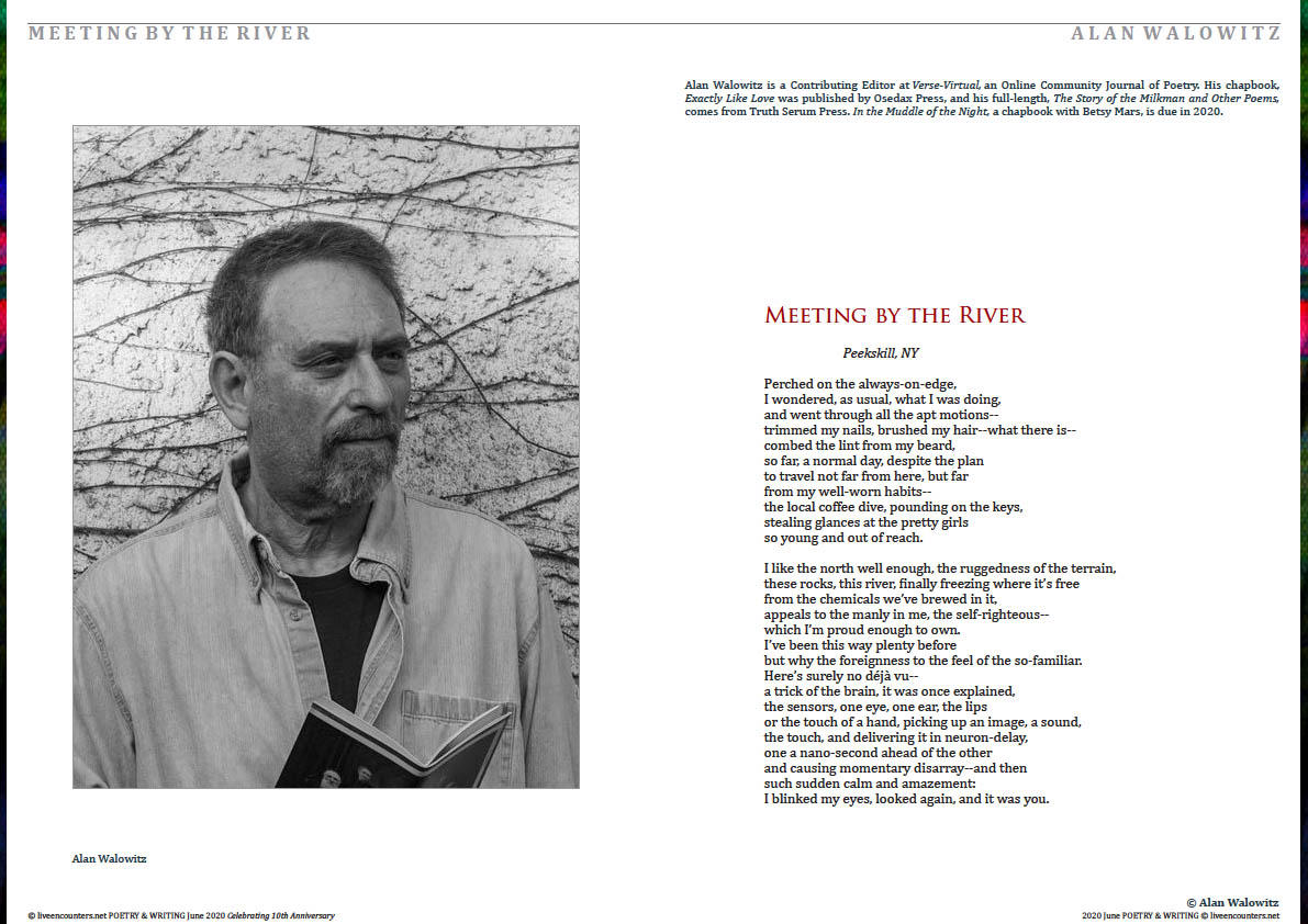 Alan Walowitz has been writing poetry for more than 50 years. He’s studied with many well-known poets who would probably not want their names mentioned with his. He earned the bulk of his fortune as a teacher of secondary English for 34 years. He also served as Coordinator of English Language Arts in White Plains, NY public schools from 1992 till 2004. Since, he’s taught at Pace University, St. John’s University, and for the last 16 years at Manhattanville College. His poems can be found on the web and off. He’s a Contributing Editor at Verse-Virtual, and his poems have been nominated for a Pushcart Prize in 2017 and 2018. Alan’s chapbook, Exactly Like Love, is available from Osedax Press. His full-length book, from Truth Serum Press, is The Story of the Milkman and Other Poems. His forthcoming chapbook, In the Muddle of the Night, co-written with poet Betsy Mars, will be published some time in 2020.