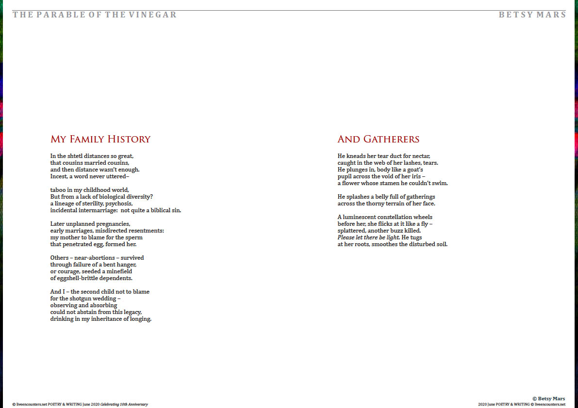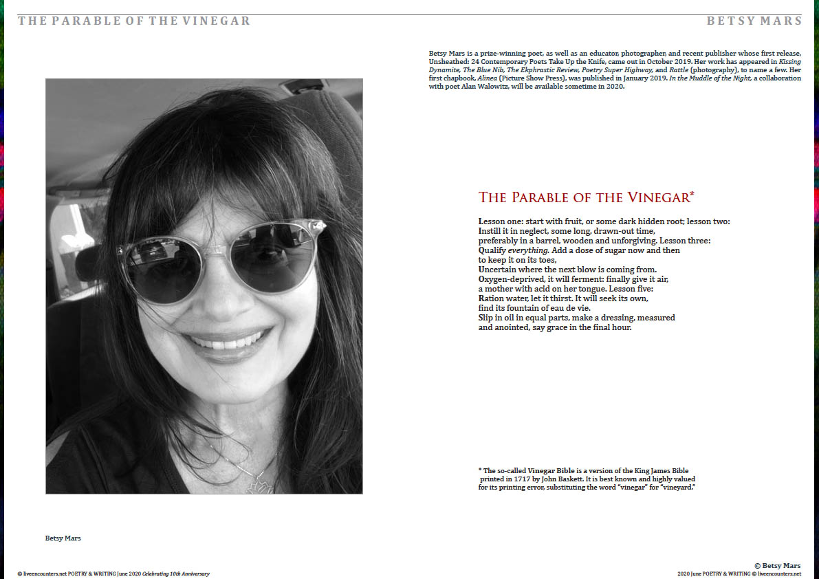 Betsy Mars is a lifelong poet, writing her first poem in Portuguese – an elegy for her cat – while her family lived in Brazil. She didn’t return to poetry in earnest for approximately 50 years and is urgently trying to make up for lost time. She works in the field of education, piecing together a living. She is also a photographer and has had photos featured in RATTLE and Praxis, among others. She founded Kingly Street Press in 2019, publishing her first anthology, Unsheathed: 24 Contemporary Poets Take Up the Knife, in October. Her work has appeared widely online in such places as Kissing Dynamite, The Blue Nib, The Ekphrastic Review, Panoplyzine, and The Poetry Super Highway, as well as in multiple anthologies. Her first chapbook, Alinea (Picture Show Press), came out in January 2019. She was recently selected as one of the winners of the Alexandria Quarterly First Line Poetry Contest Series. She is currently in the final stages of putting together In the Muddle of the Night, a chapbook she is co-authoring with poet Alan Walowitz. She lives in the coastal suburbs of Los Angeles where she occupies herself with animal maintenance and fur collection.
