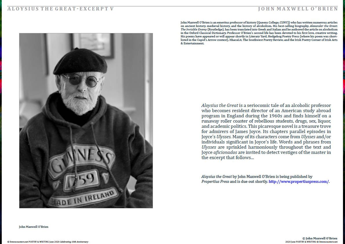 John Maxwell O’Brien is an emeritus professor of history (Queens College, CUNY)) who has written numerous articles on ancient history, medieval history, and the history of alcoholism. His best-selling biography, Alexander the Great: The Invisible Enemy (Routledge), has been translated into Greek and Italian and he authored the article on alcoholism in the Oxford Classical Dictionary. Professor O’Brien’s second life has been devoted to his first love, creative writing. His poems have appeared or will appear shortly in Literary Yard, Hedgehog Poetry Press (where his poem was shortlisted in the Cupid’s Arrow contest), IthacaLit, The Southwest Poetry Review, and the Irish Poetry Corner of Irish Arts & Entertainment.