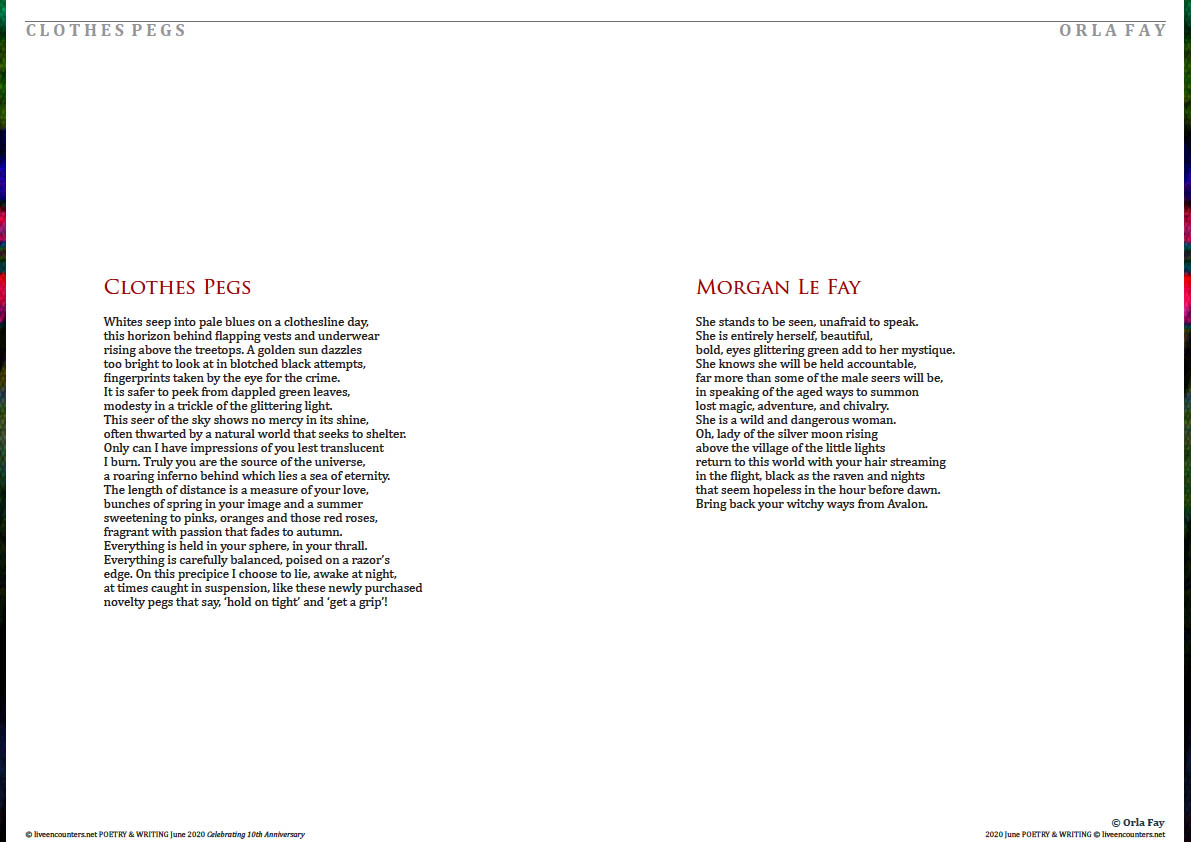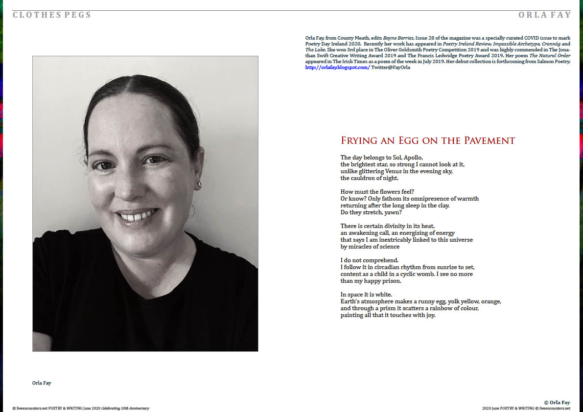 Orla Fay, from County Meath, edits Boyne Berries. Issue 28 of the magazine was a specially curated COVID issue to mark Poetry Day Ireland 2020. Recently her work has appeared in Poetry Ireland Review, Impossible Archetype, Crannóg and The Lake. She won 3rd place in The Oliver Goldsmith Poetry Competition 2019 and was highly commended in The Jonathan Swift Creative Writing Award 2019 and The Francis Ledwidge Poetry Award 2019. Her poem The Natural Order appeared in The Irish Times as a poem of the week in July 2019. Her debut collection is forthcoming from Salmon Poetry. http://orlafay.blogspot.com/ Twitter@FayOrla