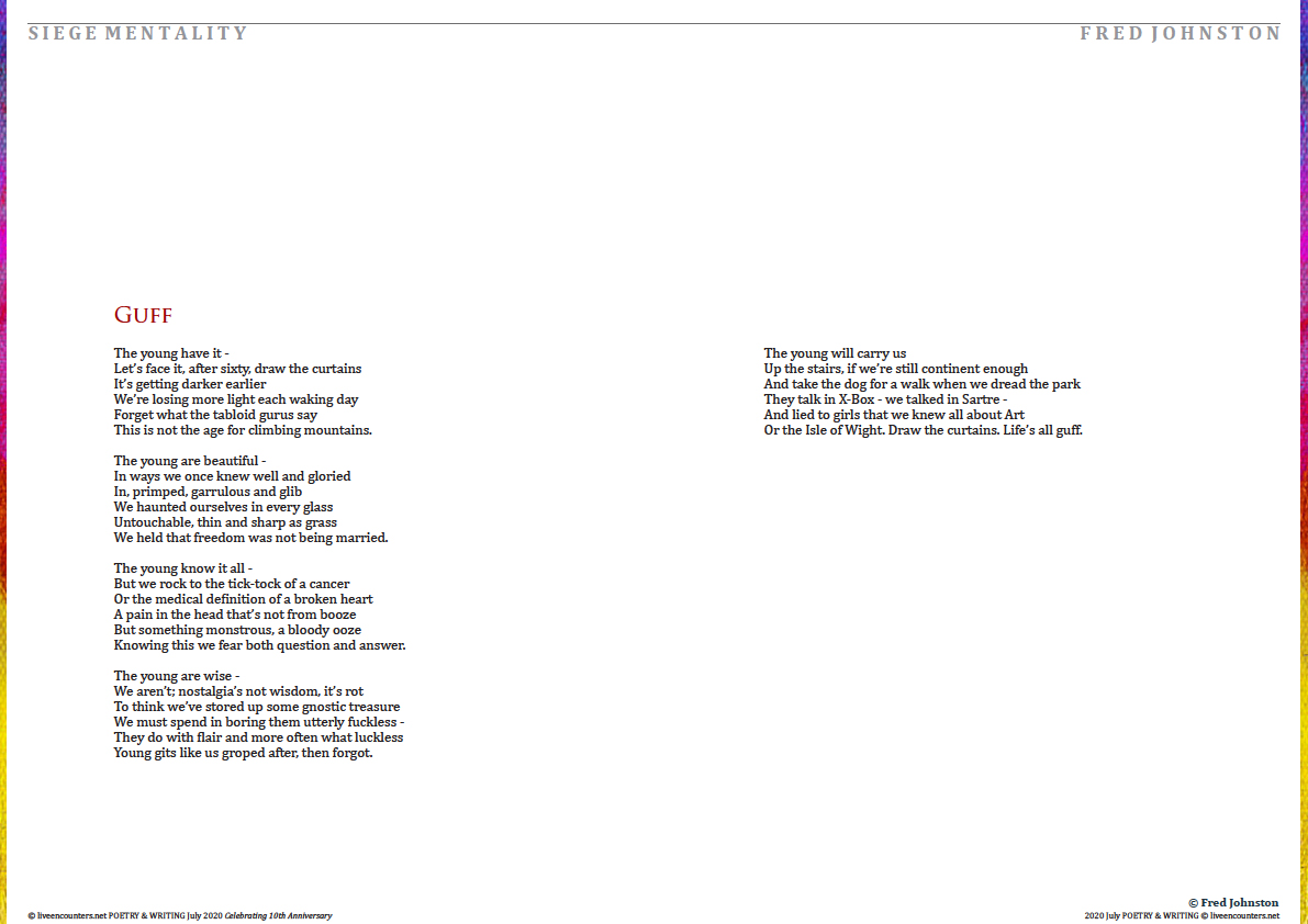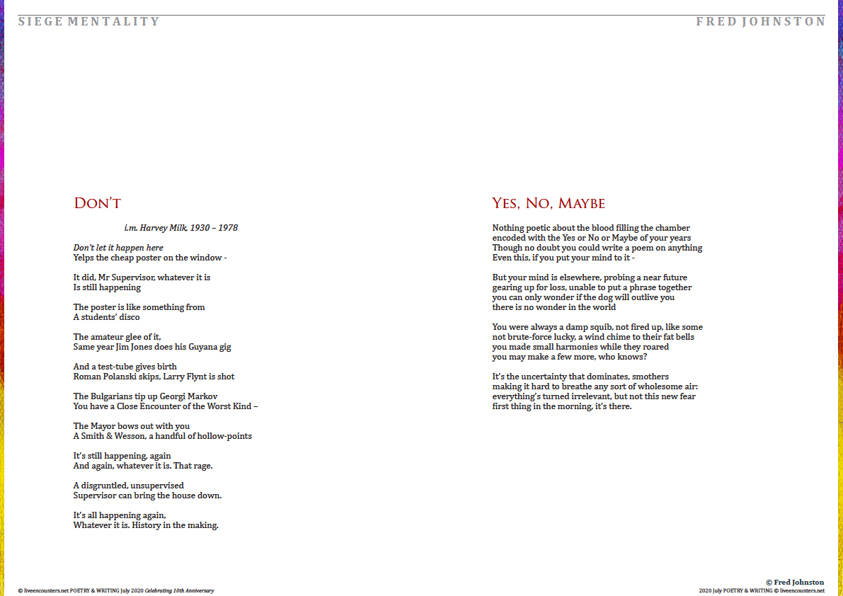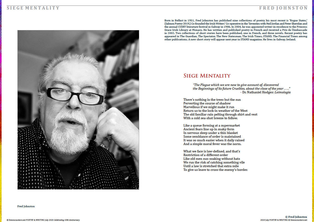 Born in Belfast in 1951, Fred Johnston has published nine collections of poetry, his most recent is ‘Rogue States,’ (Salmon Poetry 2019.) Co-founded the Irish Writers’ Co-operative in the ‘Seventies with Neil Jordan and Peter Sheridan and the annual CUIRT literature festival in Galway in 1986. In 2004, he was appointed writer-in-residence to the Princess Grace Irish Library at Monaco. He has written and published poetry in French and received a Prix de l’Ambassade in 2002. Two collections of short stories have been published, one in French, and three novels. Recent poetry has appeared in The Guardian, The Spectator, The New Statesman, The Irish Times, STAND, The Financial Times among other publications. A new short story will appear next year in STAND magazine. He lives in Galway, Ireland.
