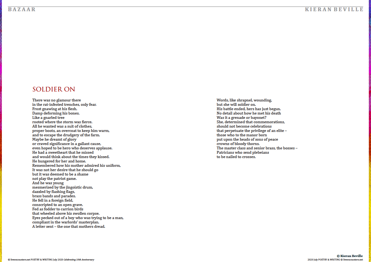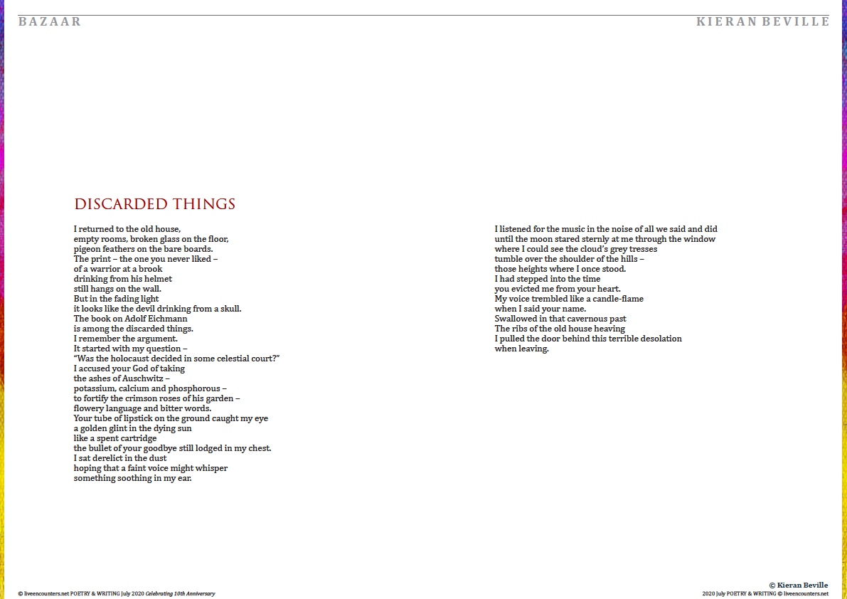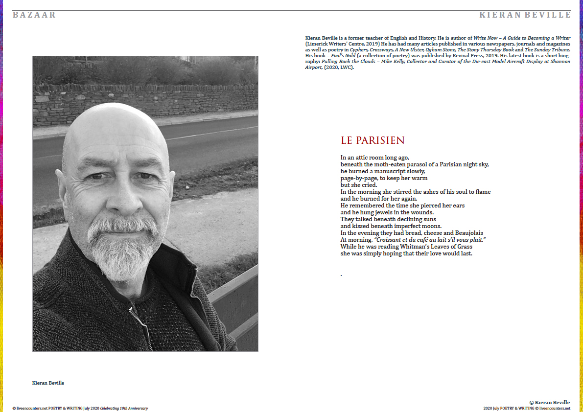 Kieran Beville is a former teacher of English (literature and language). He was a Tutor in the Irish History Dept., UCC in the 1980s and served as lecturer of Hermeneutics in the Intercultural Studies Faculty at Tyndale Theological Seminary, Amsterdam (2011-2016). He taught Leadership Training Programmes in Eastern Europe (Serbia, Hungary, Romania and Moldova) as well as Jordan and India. He has been a keynote speaker on Postmodernism in Ireland, the U.K. and India. He is author of Write Now – A Guide to Becoming a Writer (Limerick Writers’ Centre, 2019) and the novel, Bohemian Fire (pen-name Austen K. Blake, Bohemian Books, 2017). In addition he has published fourteen non-fiction books. He has had a substantial number of feature articles (approx.100) published in various newspapers, journals and magazines in the UK, USA, India and Ireland (Limerick Leader and Ireland’s Own) as well as poetry in Cyphers, Crossways, A New Ulster, Ogham Stone, The Stony Thursday Book and The Sunday Tribune. His book – Fool’s Gold (a collection of poetry) was published by Revival Press, 2019. His latest book is a short biography: Pulling Back the Clouds – Mike Kelly, Collector and Curator of the Die-cast Model Aircraft Display at Shannon Airport, (2020, LWC).