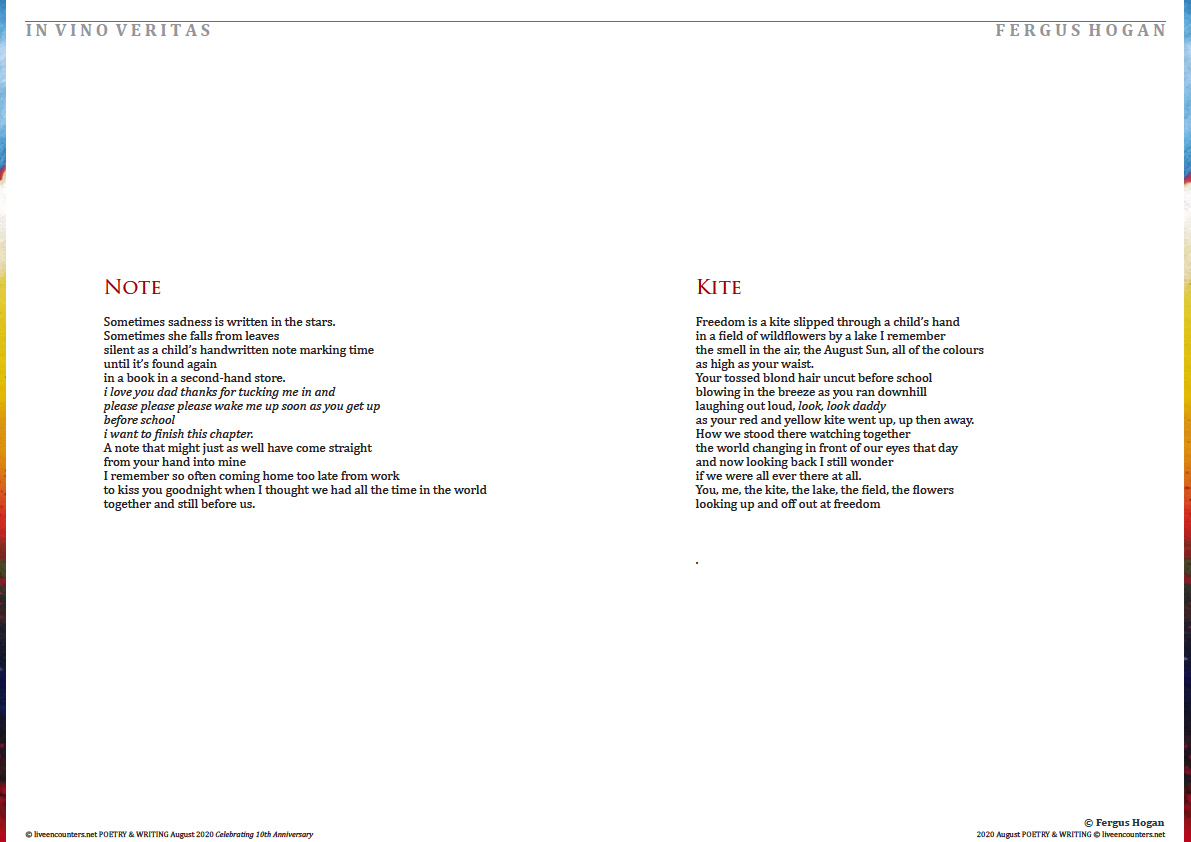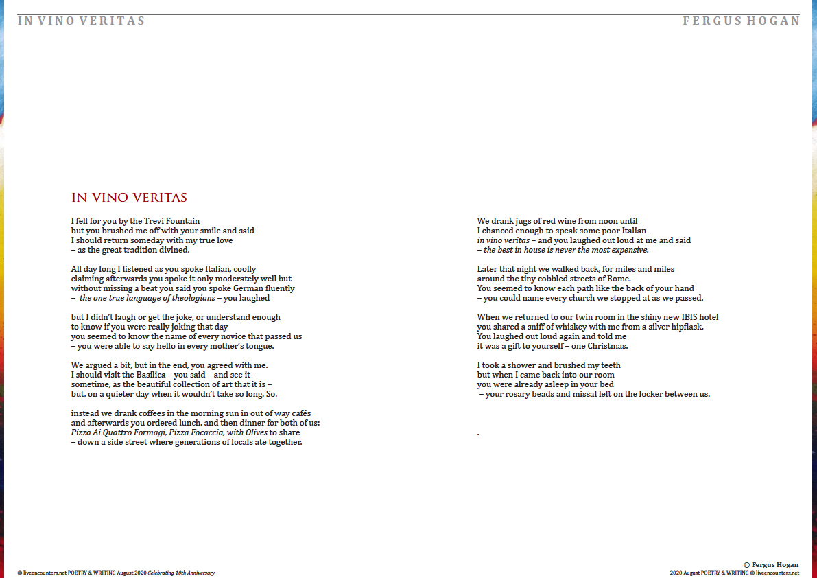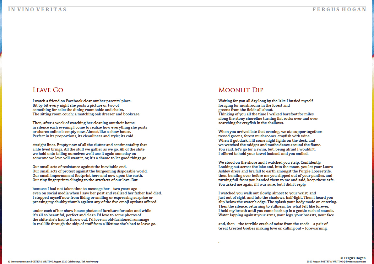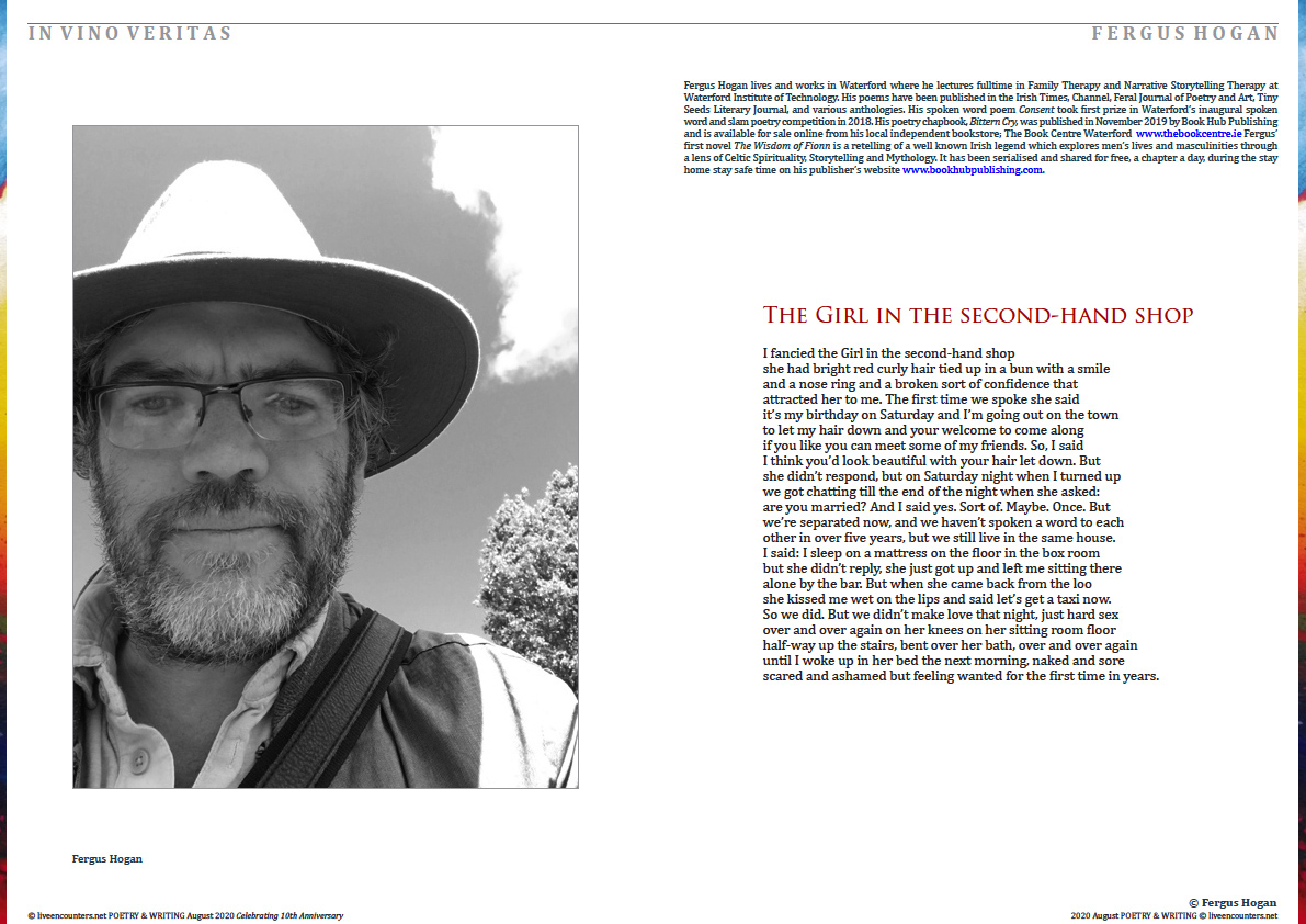Fergus Hogan lives and works in Waterford where he lectures fulltime in Family Therapy and Narrative Storytelling Therapy at Waterford Institute of Technology. His poems have been published in the Irish Times, Channel, Feral Journal of Poetry and Art, Tiny Seeds Literary Journal, and various anthologies. His spoken word poem Consent took first prize in Waterford’s inaugural spoken word and slam poetry competition in 2018. His poetry chapbook, Bittern Cry, was published in November 2019 by Book Hub Publishing and is available for sale online from his local independent bookstore; The Book Centre Waterford www.thebookcentre.ie Fergus’ first novel The Wisdom of Fionn is a retelling of a well know Irish legend which explores men’s lives and masculinities through a lens of Celtic Spirituality, Storytelling and Mythology. It has been serialised and shared for free, a chapter a day, during the stay home stay safe time on his publisher’s website www.bookhubpublishing.com.