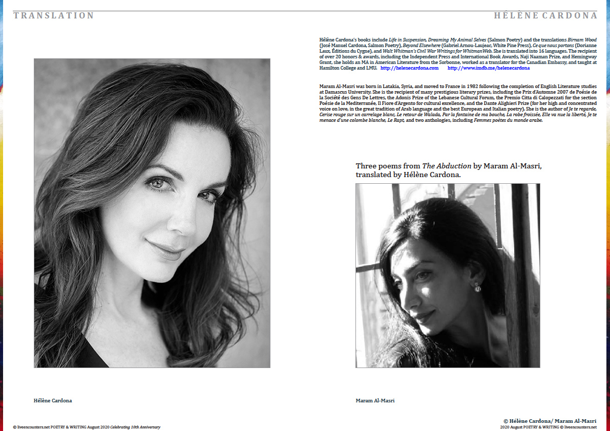 Hélène Cardona books include Life in Suspension, Dreaming My Animal Selves (Salmon Poetry) and the translations Birnam Wood (José Manuel Cardona, Salmon Poetry), Beyond Elsewhere (Gabriel Arnou-Laujeac, White Pine Press), Ce que nous portons (Dorianne Laux, Éditions du Cygne), and Walt Whitman’s Civil War Writings for WhitmanWeb. She is translated into 16 languages. The recipient of over 20 honors & awards, including the Independent Press and International Book Awards, Naji Naaman Prize, and Hemingway Grant, she holds an MA in American Literature from the Sorbonne, worked as a translator for the Canadian Embassy, and taught at Hamilton College and LMU. http://helenecardona.com http://www.imdb.me/helenecardona