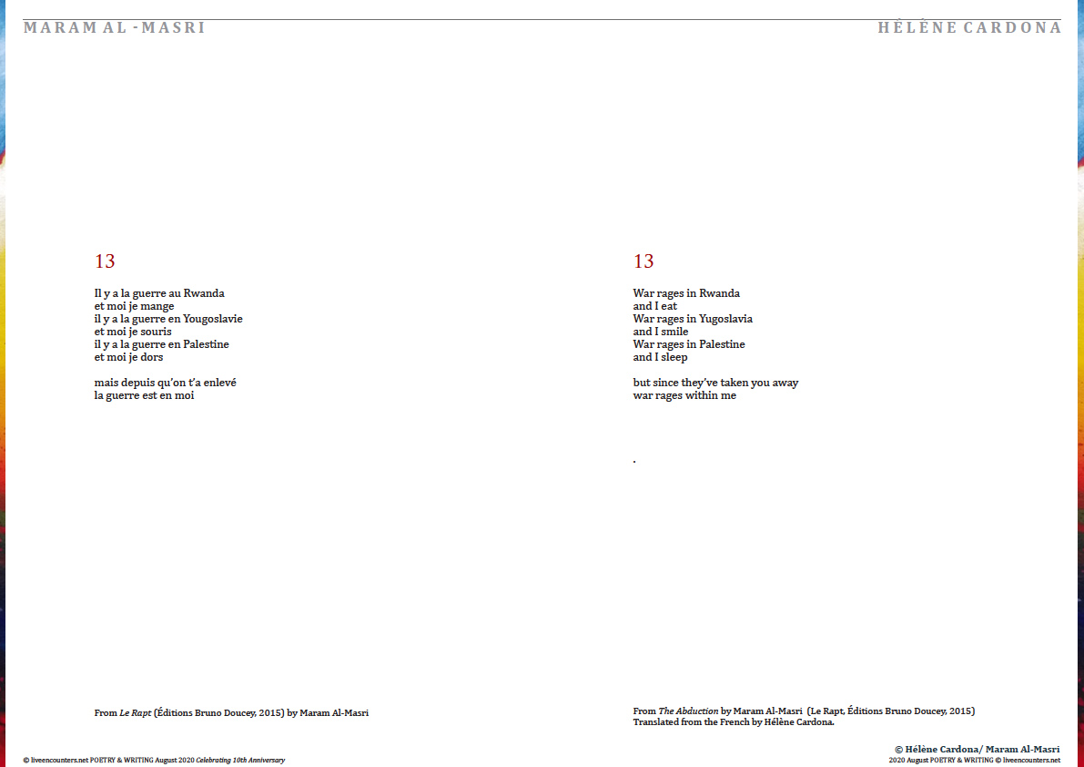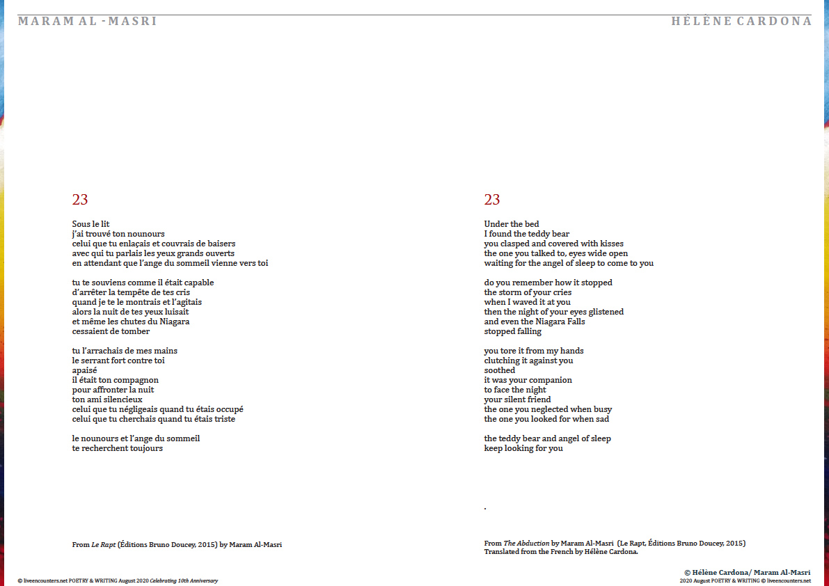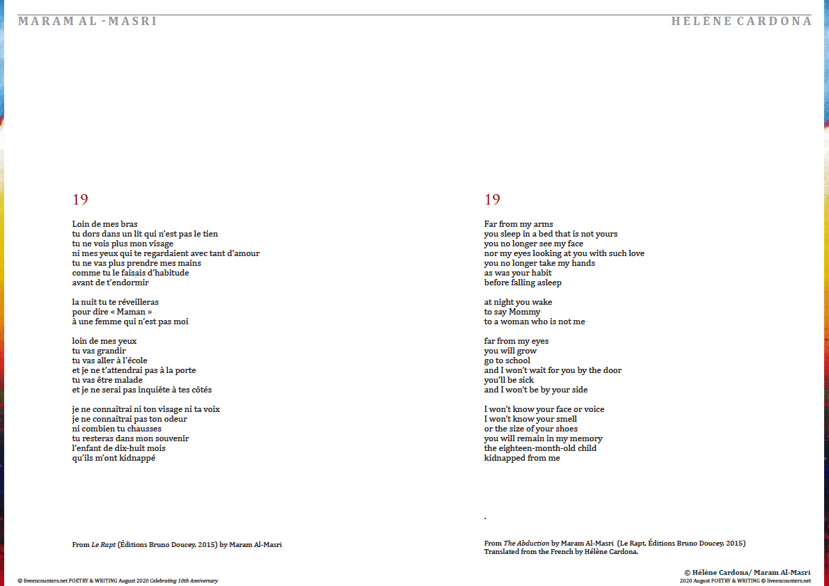 Maram Al-Masri was born in Latakia, Syria, and moved to France in 1982 following the completion of English Literature studies at Damascus University. She is the recipient of many prestigious literary prizes, including the Prix d’Automne 2007 de Poésie de la Société des Gens De Lettres, the Adonis Prize of the Lebanese Cultural Forum, the Premio Citta di Calopezzati for the section Poésie de la Mediterranée, Il Fiore d’Argento for cultural excellence, and the Dante Alighieri Prize (for her high and concentrated voice on love, in the great tradition of Arab language and the best European and Italian poetry). She is the author of Je te regarde, Cerise rouge sur un carrelage blanc, Le retour de Walada, Par la fontaine de ma bouche, La robe froissée, Elle va nue la liberté, Je te menace d’une colombe blanche, Le Rapt, and two anthologies, including Femmes poètes du monde arabe.