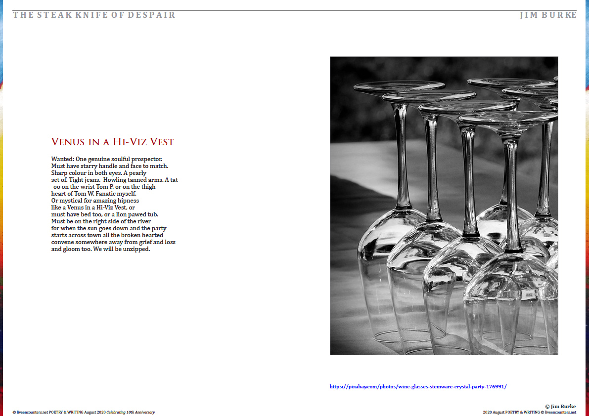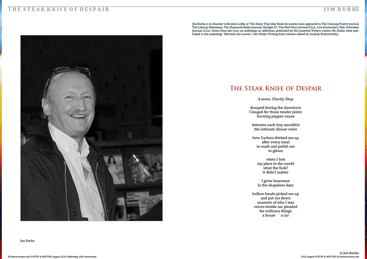 Jim Burke is co-founder with John Liddy, of  The Stony Thursday Book his poems have appeared in The Crannog Poetry Journal, The Literary Bohemian, The Shamrock Haiku Journal, Skylight 47, The Shot Glass Journal U.S.A., Live Encounters, Bali, Unbroken Journal, U.S.A. Voices from the Cave, an anthology on addiction, published by the Limerick Writers Centre. His Haiku were published in the anthology “Between the Leaves,” new Haiku Writing from Ireland, edited by Anatoly Kudryavitsky.