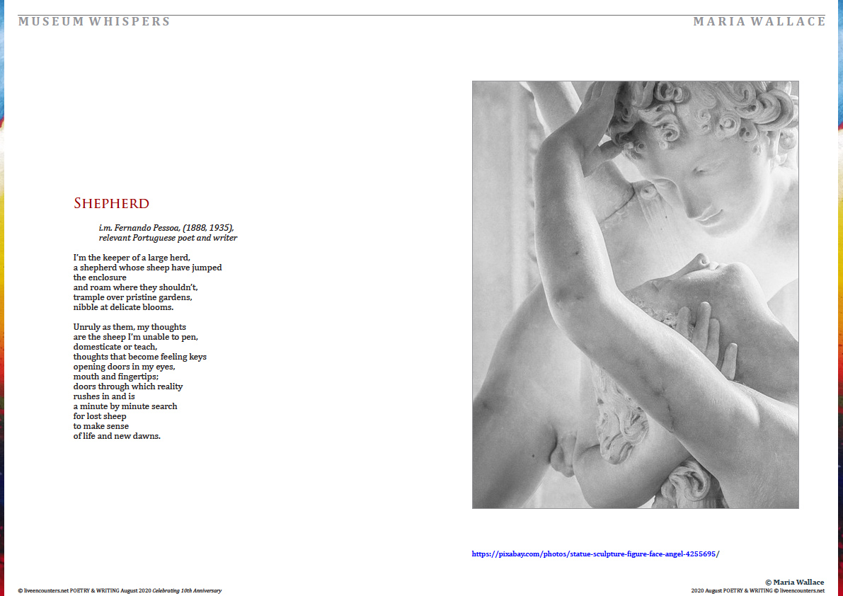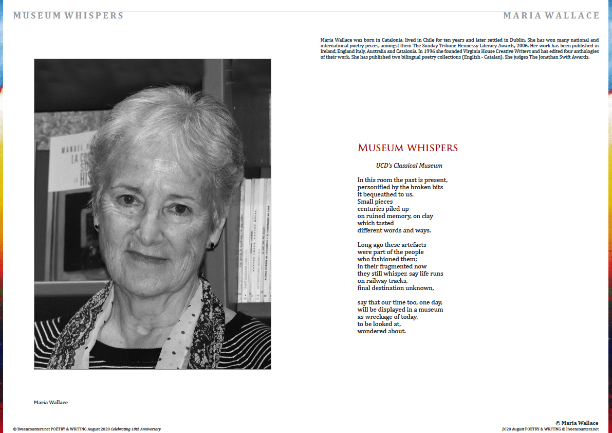 Born in Catalonia, she spent her teenage years in Chile; later settling in Ireland. She has a BA in Spanish and English Literature, and an MA in Anglo-Irish Literature. She has won many national and international prizes, amongst them The Hennessy Literary Awards. Her work has been published in Ireland, England, Italy, Australia and Catalonia, in book collections and magazines. She has published two bilingual poetry tomes (English-Catalan): Second shadow and The blue of distance. She founded Virginia House Creative Writers, which she still facilitates. Included in the UCD poetry archives, now she facilitates a weekly writers group there. She judges prose and poetry for the Jonathan Swift Awards. She has taught French and Spanish, and as a painter has been commissioned to work on different subjects. ‘The Stations of the Cross’ in the Oratory of The Square Shopping Centre in Tallaght is amongst her work.