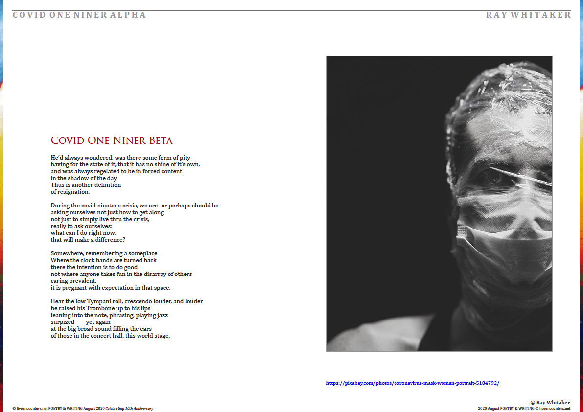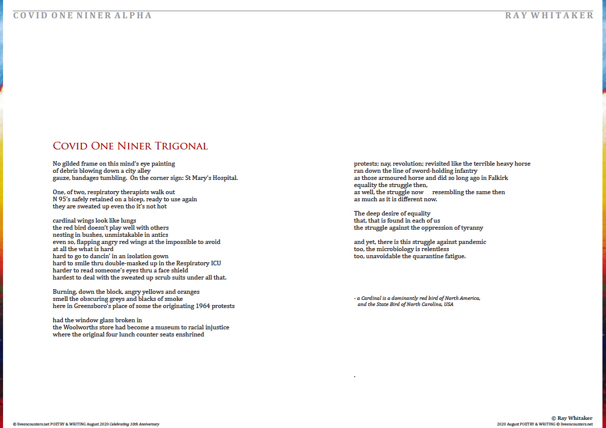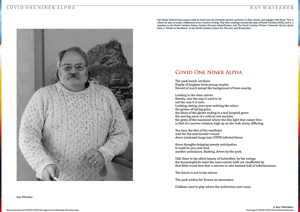Ray firmly believes that poems need to reach into the everyday person’s pictures in their minds, and engage with those. This is where he aims to make a difference in his creative writing. Ray does readings around the state of North Carolina [USA], and is a member or the North Carolina Poetry Society, Winston-Salem Writers, and The North Carolina Writer’s Network. He has thrice been a ‘Writer-in-Residence” at the North Carolina Center For The Arts and Humanities. He has two books published, “ACKNOWLEDGMENT: Poems From The ‘Nam,” 212 pages, 03/2015; “23, 18,” 106 pages, 10/2015. He has two other books he is presently seeking publication for: ‘WHITE DOG SPEAKING,” 88 pages, 2016; and “FOR THE LOST AND LOVED,” 93 pages, 2018. Some of his work has been published in American, Irish, English and Scottish Literary Journals.
